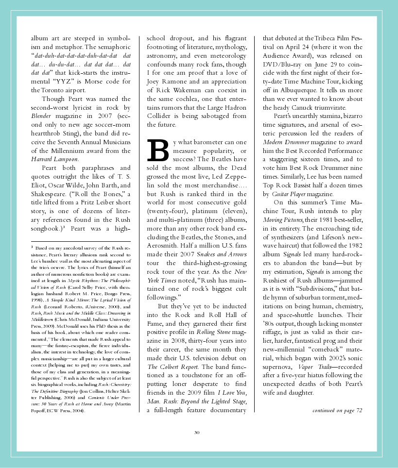 A couple of months back I'd mentioned that the July/August issue of The Believer contained a piece about Rush by Skylaire Alfvegren titled Grokking Rush. At that time a short excerpt from the article was made available at this link. The full version now available online at Alfvegren's website and you can also check it out by clicking on the thumbnails above.