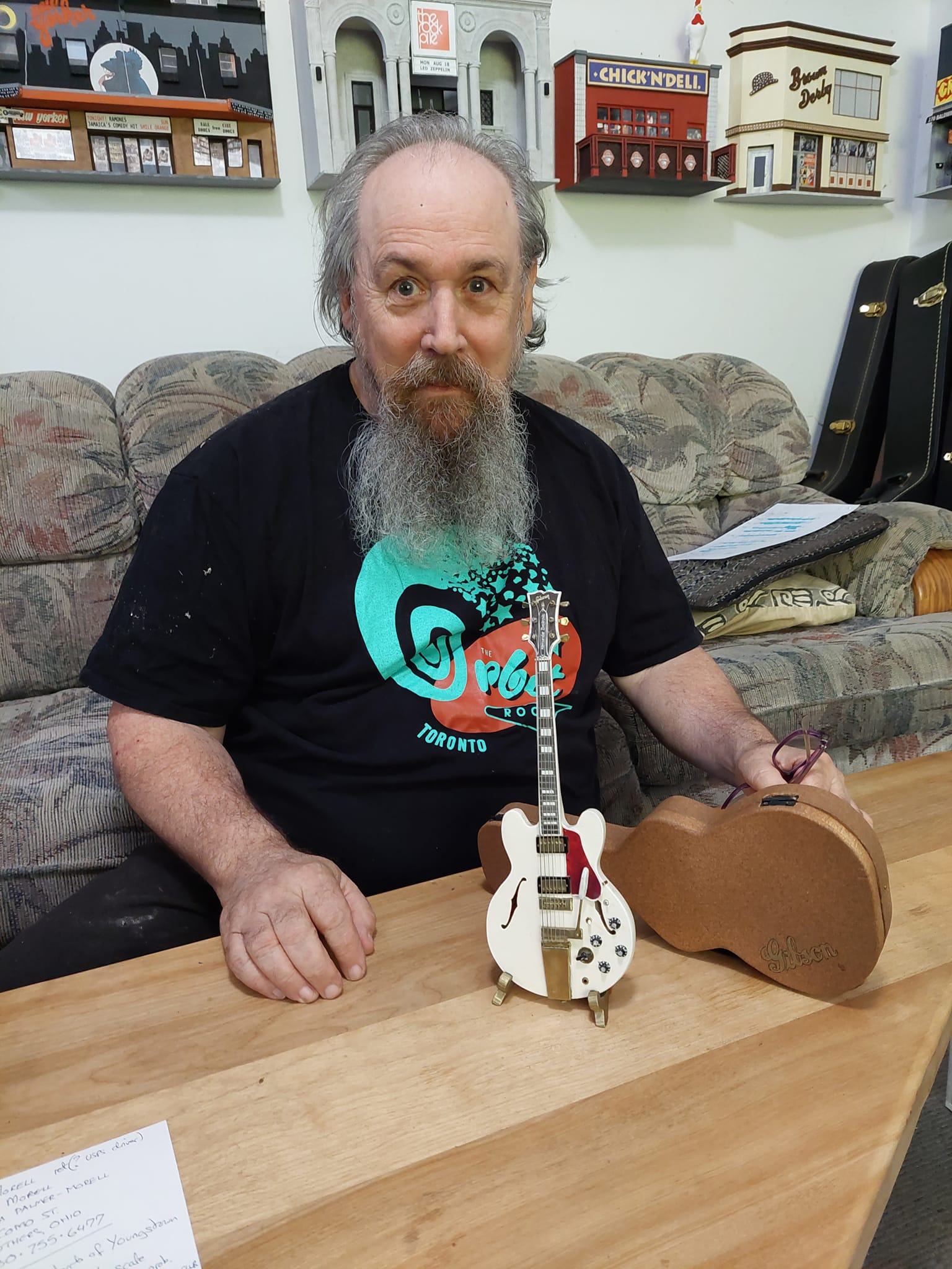 Dear friends of the Orbit Room and RUSH fans. During our time on College Street, Rush fans would sometimes send letters and parcels to Alex via the club. Usually these items were forwarded to the office but this one item was admired and then put in a box in a closet and forgotten about for 10 years. A lot of stuff from the closed location ended up in my garage. It's when Alex auctioned off a lot of his guitar collection that I went searching. It is a 7 1/2 inch scale model of a Gibson 355, just like the one Alex had played for years. Built by a fan in Struthers Ohio, it needed a little TLC so I took it to Andrew Smith, creator of the "Toronto, Lost Music City" models for a tune up.( See pics of Andrew and the Orbit Room model) So, 10 years later, from a fan in Struthers Ohio by way of the Orbit Room and Andrew's studio, the tiny 355 is finally on its way to Alex.