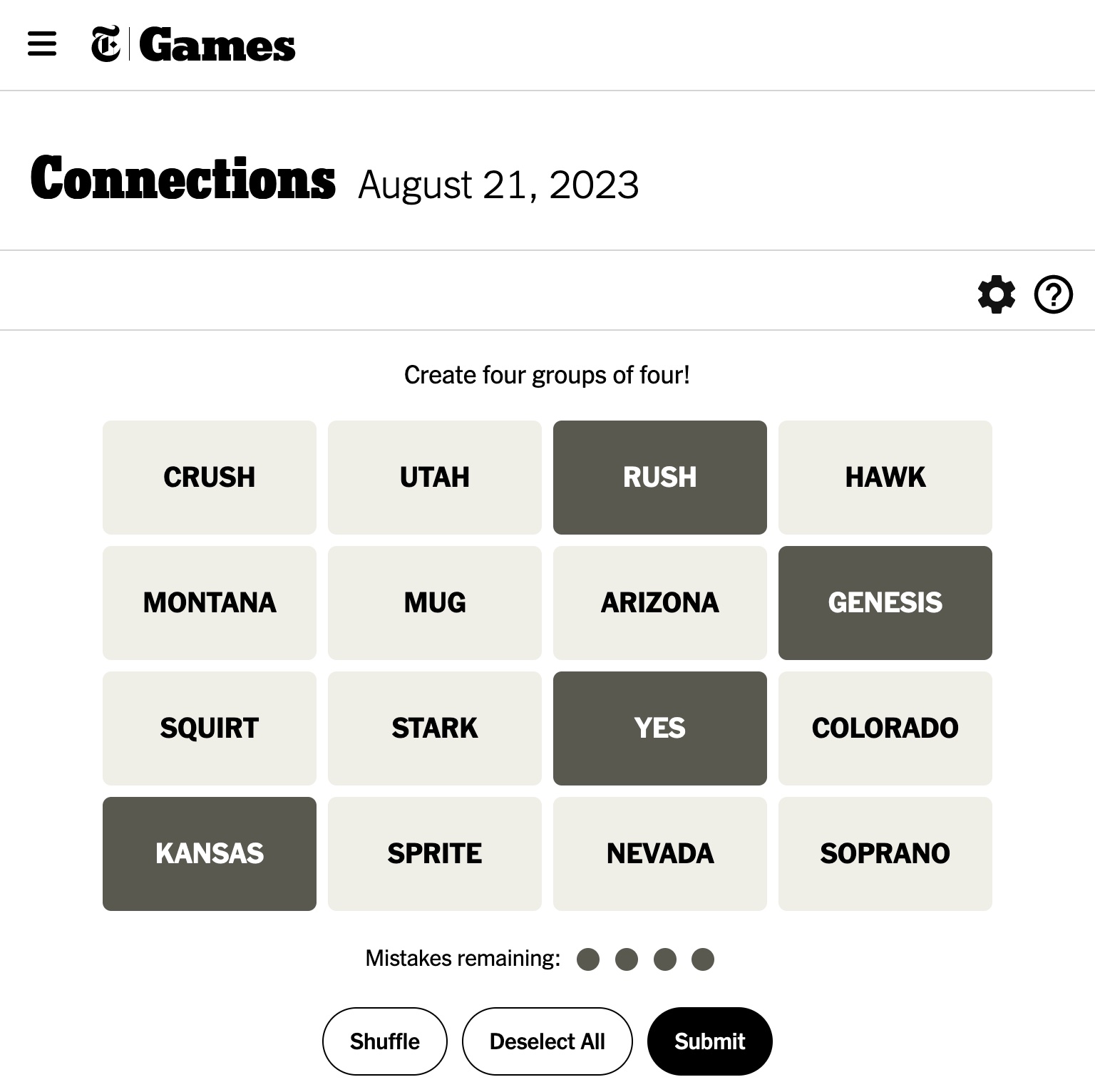 The New York Times online game Connections had a Rush-related clue for this past Monday's puzzle. The idea of the game is to find connections between 4 of 16 things listed out in a grid of tiles. Four of the tiles were Rush, Genesis, Yes and Kansas - which when grouped together formed a Classic Rock Bands connection as seen in the screenshots. Thanks to Derek B and Phil Simon for the heads up.