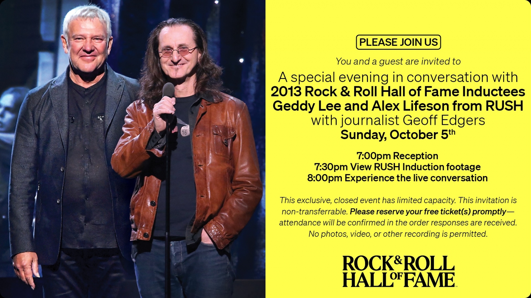 The band first revealed the news yesterday evening to a small group of VIPs, industry insiders, music journalists, Rock Hall members, and special guests at the Rock and Roll Hall of Fame in Cleveland, during what was dubbed a special evening in conversation with 2013 Rock & Roll Hall of Fame Inductees Geddy Lee and Alex Lifeson hosted by journalist Geoff Edgers. The event kicked off with a brief introduction from Rock Hall VP of Education and Visitor Engagement Jason Hanley, and they then showed footage of the band's 2013 Rock Hall induction. Rock Hall CEO Greg Harris then came out to introduce Edgers and Donna Halper, who gave her well-known story of the role she played in the breaking of Rush in the US. Donna then introduced Geddy Lee and Alex Lifeson, and Edgers kicked off the interview.