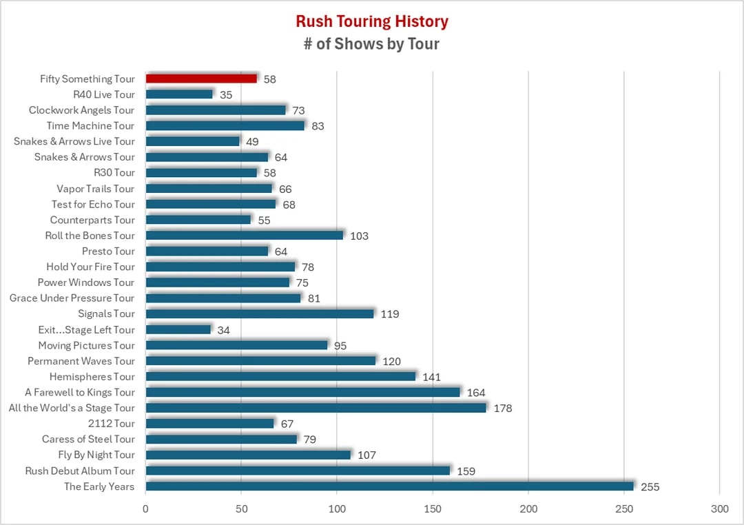 Now that the tour itinerary is essentially set, we can take a look at the schedule and see how it all will play out, and whether any more dates/legs might be added. Since the band reformed in 2002 for Vapor Trails, Rush tours have generally been around 40-ish shows, although they would often split that across 2 tours - the Snakes & Arrows tour had one marathon, 64-date tour in 2007, then they returned for a 49-date tour in 2008 (to support Snakes & Arrows Live). They did something similar for the Time Machine and Clockwork Angels tours. They would then split those 40-ish show tours into 2 or 3 legs with a week or 2 off in between. They would also always give themselves at least one night off between shows, and rarely play more than 1 show in any given city (Toronto being the one exception). The Fifty Something tour stands to be a bit different, with the band playing at least 2 shows in every city, with at least 3-4 days off between cities, and a day off between shows in a given city, spreading the 58 shows out over a nearly 7-month period. This seems to be their intention - to give themselves a bit of rest between cities, so it's unlikely they'll squeeze in any more. Although there are a few spots where that break between cities is more like 7-10 days. In those cases, they could theoretically add 2 shows in another city, and still have at least a 2-day break on either end. The band has 16 days off between Fort Worth and Chicago in the first half of July, 8 days between Toronto and Philly in mid-August, 8 days between Montreal and Boston in early September, 10 days between San Antonio and Denver in late September, 8 days between San Jose and DC in mid October, 9 days between Tampa and Charlotte in mid-November, and 7 days between Glendale and Edmonton in early December. Again, this may all be by design in order to give the band and crew some needed breaks here and there, but nothing about this tour has followed past patterns, so anything could happen. But what about Europe? Although those 7-10 day breaks could work to squeeze in a couple North American shows, that's not enough time to fly over the pond and play more than just a couple shows - even that 16-day break isn't quite enough. So if they do decide to do a European leg - something that I expect to happen with all I've been hearing - it will likely be in 2027 AFTER the North American leg, with the Spring being most likely. It's unclear when that announcement might occur however, so stay tuned.