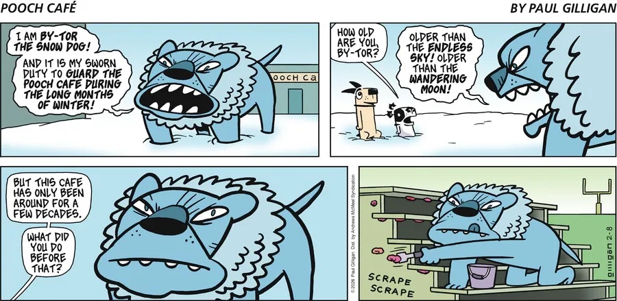 There was another Rush Fly By Night reference in the online comic Pooch Cafe this past week (thanks John B). There's a big, white dog character who calls himself By-tor the Snow Dog, who guards the Pooch Cafe during the long months of winter. The character originally showed up in a strip last January 26th.