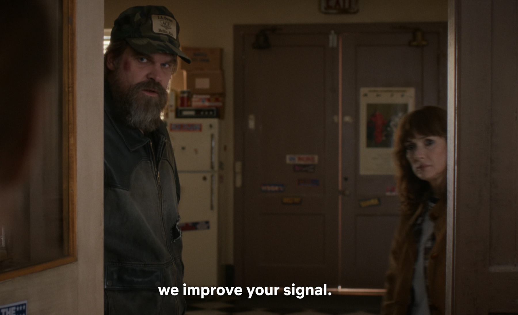 The first 7 episodes of the final season of Netflix's mega-hit show Stranger Things is currently streaming (the finale releases on New Year's Eve), and reader Steven M spotted a Rush Signals poster at the 27-minute mark of Episode 6 (Escape from Camazotz). The poster is seen on the door of the radio station where Eleven, Mike, Joyce and Hopper are strategizing their next move. Coincidentally, the line Hopper says as the poster is seen in the background is, Or ... we improve your signal. You can check it out right around the 27-minute mark of the episode here (subscription required). There have been a couple of other Rush references on the show - both occurring in Season 4. During the Season 4 premiere (Hellfire Club), right around the 11-minute mark, Jonathan Byers (Charlie Heaton) is dispersing pot smoke in his bedroom using Rush's debut album cover as seen here. Then in Episode 4 that same copy of Rush's debut album can be seen on the floor of Will's room as displayed in this screenshot